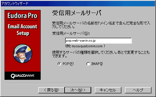 - 〔受信用メールサーバ〕は、pop@web-sanin.co.jpを半角で入力します。
