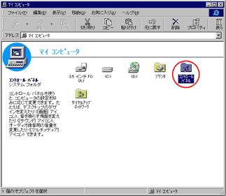 - デスクトップの〔マイコンピュータ〕を開いて、〔コントロールパネル〕をダブルクリックします。