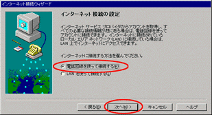 - 電話回線を使って接続する(P)をチェックして、次へ(N)をクリックします。