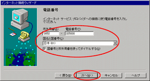 - 国番号と市外局番を使ってダイヤルする(D)をチェックして電話番号を入力し、次へ(N)をクリックします。