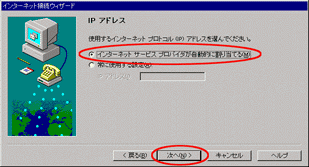 - インターネット サービスプロバイダが自動的に割り当てる(M)をチェックして、次へ(N)をクリックします。