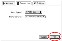 - 115200bps、または57600bpsを選択します。ただし、Power Macintosh以外の機種をお使いの場合は57600bpsを選択します。