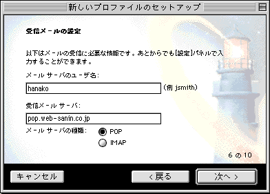 [受信メールサーバ]には、pop.web-sanin.co.jpを半角で入力します。