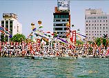 湖面は大きくしぶきが立ちはじめ大きく飾り付けられた船団の吹流が大きくはためき、その度に船は右へ左へ大きく揺れる。”ホーランエンヤ・・・・・”