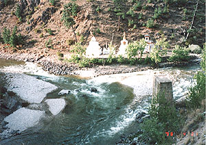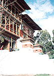 ■チュゾン(ティンプー橋) 川の向こう岸には、小さな三様式のチョルテンが建っていた。多分この地方の主要地点ということかもしれない。 チュゾンを出発して行くと、やがて車窓の左向こう山の中腹にある小じんまりと美しいラカンが目に入った。