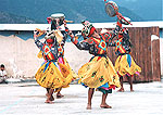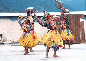 市街地から、少し北に上がったところに王立舞踊団見学広場がある。建物などはなく、周囲に簡単な塀をめぐらしただけの広場である。 何件かの演目を見学したが「ツェチュ」(お祭り)の仮面舞踏は普通僧侶が踊る出し物のようである。本物の「ツェチュ」に出会えたらもっと素晴らしいのではないかと思った。(ブータン舞踊団は、島根県の大東町でも公演(H9.11.16)されたことがある。) 夕方、最後の訪問地パロへと向かった。帰り道は、明るいうちの峠越えだったので周囲の景色、道路(ブータンでは最も整備された主要道とのこと)の状況がよくわかった。狭いカーブの多い道路であるが、ガードレールなどは無い、夜間に通行する車両のために、道ばたの置き石や、山側の崖から突出した石に白いペンキ(?)を塗り、路側の標識にしていた。(ティンプーに入るとき、ライトに照らし出される白い石は何だろうと不思議に思っていたが、その謎−正体−がわかった。)