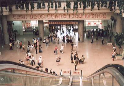 長春駅コンコース 手前はエスカレーターでホームへ登る