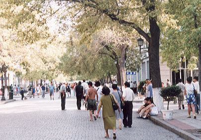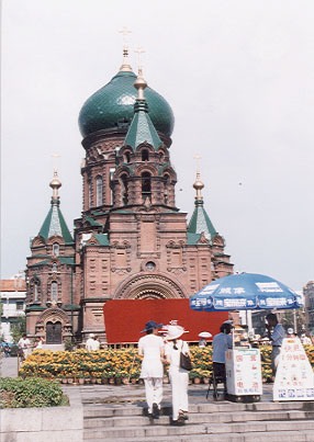 午後は「聖索菲亜教堂(せいそふいあきょうどう)」や黒龍江省民族博物館「文廟」、そして中央大街へと見学して回った。ハルピンを称して「東方のパリ」と言われているが、中央大街を散策してみると、特にその情景を肌身をもって感じとることができる。中央大街には、馬迭爾賓館をはじめくさんの欧風建築物が建ち並び、道路は広く石畳を敷き詰めた立派なものである。