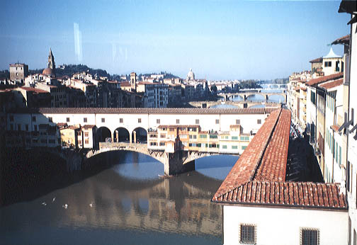 “橋の上の商店街”アルノ川に架かるフィレンツェ最古の橋(1,345年完成)で、ウフィツィ宮殿と川の向こう(南側)のピッティ宮殿を結ぶ回廊として建設された。石造り(二層)橋の上(1階部分)には貴金属や宝石店が並んでいる。高級ショッピング・アーケード街である。また、橋の片側階上(2階部分)が回廊となっており、北側のベッキオ宮殿、南のピッティ宮殿とをつないでいる。(この橋はその回廊の中間地点にあたる。)