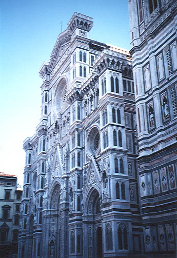 教会の正面は、再建(1,887年)されたものといわれる。外壁は白、ピンク、緑色等の大理石をふんだんに使った造りになっており、“花の大聖堂”の名にぴったり.....実に壮麗である。特に、幾何的壁面構成はなんともすばらしく表現の言葉もない。