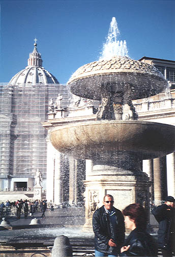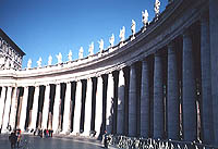 収容人員6万人、祭壇50基、柱 500本。中には、ミケランジェロやベルニーニらが製作した彫像 450体が置かれている。寺院の規模は、面積1万 5,160平方メートル、そして間口 115メートル、奥行き 211メートル、高さ45メートルという巨大な寺院である。 設計・監督はミケランジェロやブラマンテがあたったという。堂内は、まさにルネッサンス美術の宝庫である。 現在、寺院は2,000年のキリスト生誕祭に向けて大修理中であったので、その壮大な建物の外観(全容)を見ることはできなかった。しかし、広場の中央に立ってみると、馬蹄型に広がる回廊が、その偉容を一層大きく感じさせ見学者を引きつける。回廊のいちばんの見どころは列柱の美しさにある。広場の中央に立ってみると、いちばん前の柱(広場に面した柱)しか見えないが、実はその後ろに3本の柱がひかえている。4本の列柱が放射線状に並んでいるため、後ろにある3本の柱は、前の柱に隠れて見えないのである。だから回廊の柱の数は正面からは71本しか見えないが、総数は 284本ある。上部(屋上)には 140体の聖人像が飾られている。