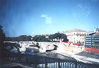 ●テベレ(Tevere)川と、ティベリーナ島(Isola Tibenina)(車窓から)