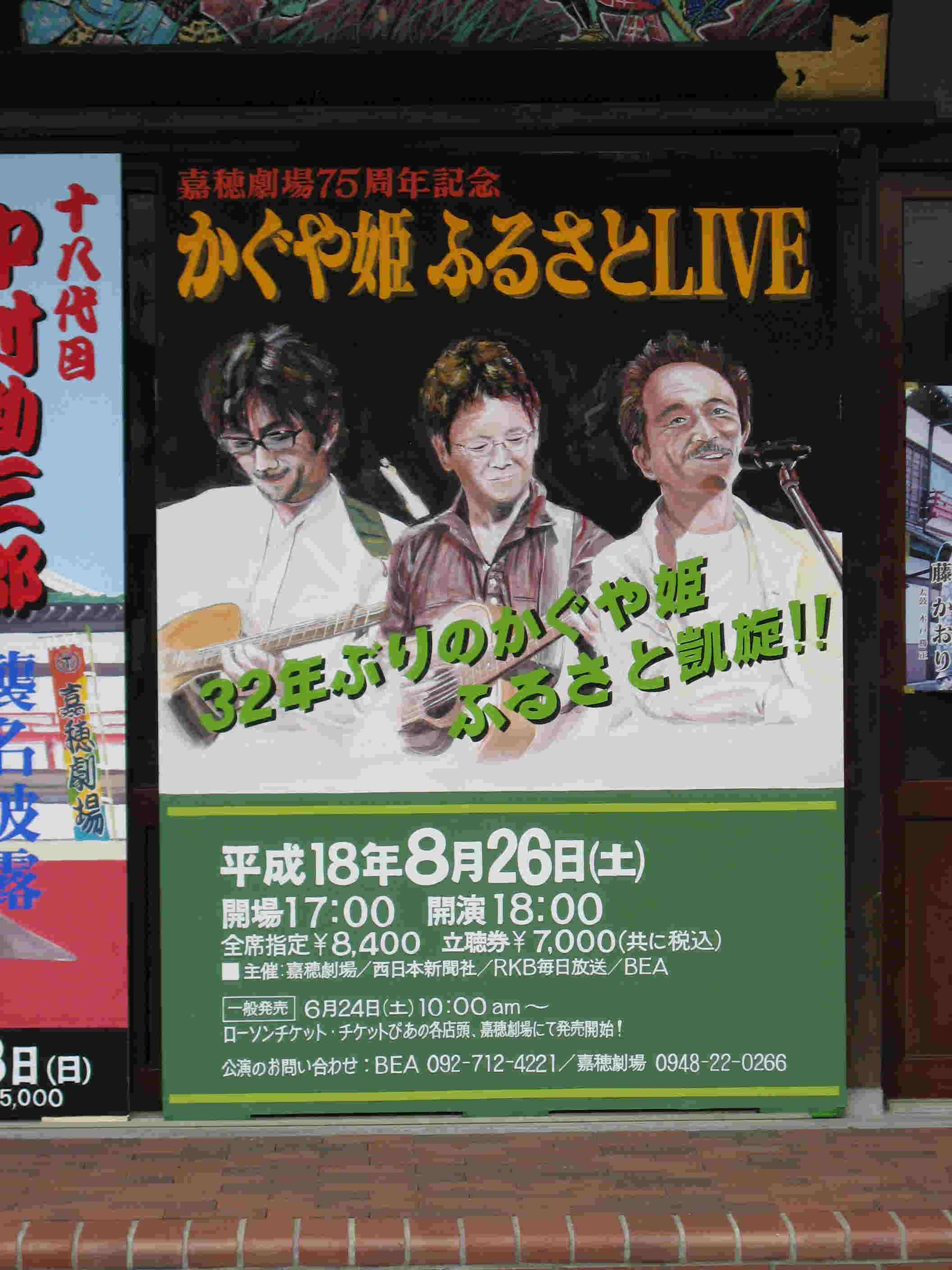 かぐや姫が、8月26、27の両日、3人の出身地の九州2カ所でで32年ぶりにコンサート。福岡県飯塚市は、メンバー最年長のパンダさんが高校2年から浪人時代までの3年間を過ごした、まさに多感な青春時代を送った思い出の地です。もう1カ所の大分市は、リーダーこうせつさんの生まれ故郷で、近くの津久見市で生まれた正やんとともに、大分舞鶴高校に通った「ふるさと」なのです。 その2会場を楽しもうと、勇んでいたのですが、結局、嘉穂劇場だけの鑑賞となりました。でも、他の人たちからは「嘉穂劇場」を観られたら、OKでしょう」と慰め、励まされて九州入りを果たしました。 大変遅くなりましたが、その「ふるさとLIVE」のコンサートレポを、簡単に紹介します。 8月26日午前6時42分に、朝飯のコンビに弁当を手にJR出雲市駅を出発。飯塚駅に到着したのが正午過ぎ。駅前から嘉穂劇場まで徒歩15分。途中、住宅街を歩くが、駅前から空き家と空き店舗が連なるのが気になった。どこも同じ現象だろうが、かつて炭鉱の町だったこの飯塚市は衰退振りが目立ったように思えた。 ひとまず嘉穂劇場の場所を確認して、昼食をとる店を探したが、やっぱり九州ラーメンを食べねば、と商店街を物色。すぐ近くに「宝ラーメン」ののれんを見つけて入った。暑さで汗が吹き出ていたので、まずはビールでのどを潤して、とんこつラーメンをすすって替え玉もして、腹ごしらえは終了。(あとで分かったけど、パンダさんオススメのおいしいうどん屋が近くにあったらしい) 午後1時を回っていたので、嘉穂劇場に向かうと、正面玄関にこあらさんらの姿が目に入った。チケットが手に入らなくて、入り待ちしていた女性も。入り口付近には、ワゴン車が横付けになっていて「今、3人が入っちゃいましたよ」と教えてくれた。残念だったが、久しぶりに会ったこあらさんらと近況を語り合った。 あまりの暑さに水分補給しなければ(?)、とビールを買いにコンビニに向かおうとしたら、こうせつさんのバックサポートの細井さん、玉ちゃんが楽屋から出てきた。「きょうは楽しみにしています」と声をかけると「きょうは2人は観客。サポートは順平さんひとりです。あすの大分はやりますよ」と言って、アーケード街にあるというおいしいうどん屋に向かって歩いて行ったのでした。へぇ、3人だけと、サポートひとりのかぐや姫コンサートもレアだよな」と思いつつ、コンビニでビールを買ってぐいっと。 嘉穂劇場は、75年前に開館した芝居小屋で、入り口前には、落語公演や渡辺貞夫さんのステージの手書き看板がズラリ。大正時代の雰囲気をかもし出していた。そして、関西オフ会が贈った花輪も玄関横に飾られて「ふるさとLIVE」を守り立てていた。近くを散策してみると、なんと、劇場のすぐ裏通りに「スナックスタンド・パンダ」の看板を見つけた。こあらさんに教えると「さっき見つけました」としばし話題に。こりゃまた、偶然の出来事とはいえ、かぐや姫ファンにはうれしくなるシチュエーションですよね。 ファミレスで休んでいると、急に空が暗くなってまもなく雷を伴った土砂降りの雨。2階にある店の入り口から水が流れ込み、従業員が必死の排水作業。耳を劈く雷鳴に「こりゃ、3人のメンバーを手荒く歓迎しているな」とつぶやいてしまった。でも、開演1時間半前には雷も過ぎた。合流したカズさん、ホジさん夫妻と、miyamoとともに会場に。 前触れが長くなってしまっちゃいました。会場に入場してすぐにグッズ販売の掛け声が響いた。パンダさんのCDを購入すると先着500人(だったかな?)に「握手権(券)」が付いているというので、思わず購入。オリジナルTシャツと、芝居小屋らしい雰囲気を表した嘉穂劇場の日本手ぬぐいを記念に買った。(3年前の水害で劇場が被害を被ったため、このタオルの売り上げを劇場に寄付しようとチャリティーグッズとして作られました。ステージでも、こうせつさんが件名にPRしていました) 場内はやっぱ狭い。定員1400人と表示されていたけど、もっと少ないように見えた。立ち見込みの人数かも。くつを脱いで6人がけの升席はやや窮屈だった。場内は立ち見も多くて熱気でむんむん。こあらさんからいただいた関西オフ会のかぐや姫うちわをあおいでいないと、汗が流れるほど。始まるまでは、ビールもOKで、歌舞伎公演みたいにお弁当を食べる人もいるなど、いつものかぐや姫コンサートとはちょっと違う雰囲気。。もう二度とないであろう嘉穂劇場での珍しいかぐや姫コンサート。今思えば、嘉穂劇場の関係者が売りに歩いていた劇場のグッズも買っておけばよかった。 会場にはパンダさんの奥さん慧津子、お母さんの姿も。慧津子さんは場内を忙しく走り回っていたので、結構目立っていた。 つっきーとあいさつを交わしていよいよ公演。3人は、アイルランド風の音楽をバックに、花道から登場。開演前から観客は花道の方をかなり気にしていたけど、はやり期待通りだったみたい