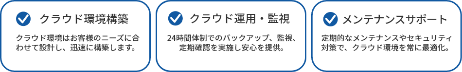 - クラウド環境は常に最新の状態で保つことが重要です。定期的なメンテナンスやセキュリティ対策を実施し、最適なパフォーマンスを維持します。また、万が一の障害やトラブルにも迅速に対応し、問題解決までしっかりサポートします。